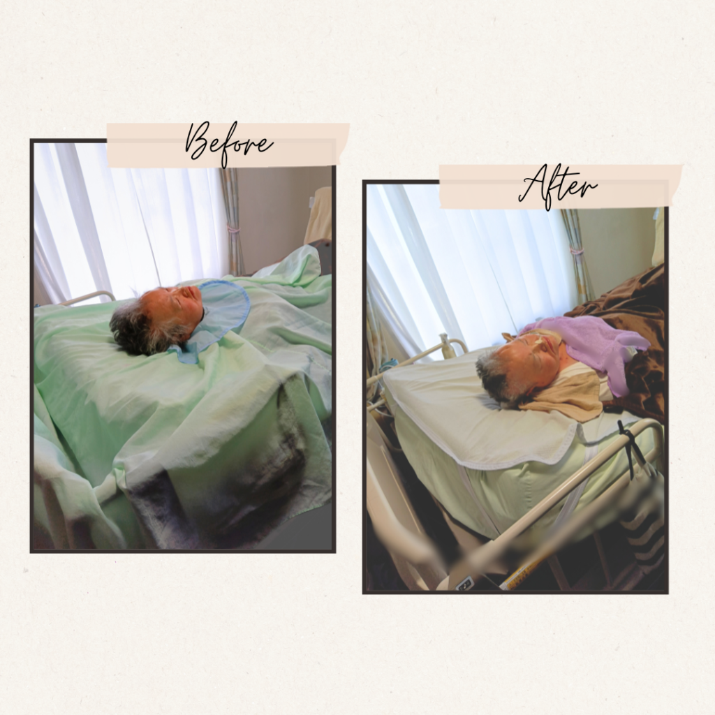 ベッド上ではお手入れしやすいスタイルが好まれます。お顔の周りをスッキリと襟足も痒くならないように短めにさっぱりさせていただきました。